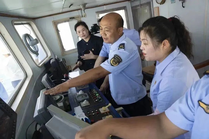 與以往不同,本次主題黨日活動(dòng)登上漁政37605執(zhí)法船。正值禁漁期執(zhí)法階段,黨員代表們隨漁政執(zhí)法人員一起,出海巡航,沉浸式體驗(yàn)海上執(zhí)法,感受海上執(zhí)法的艱辛與不易。