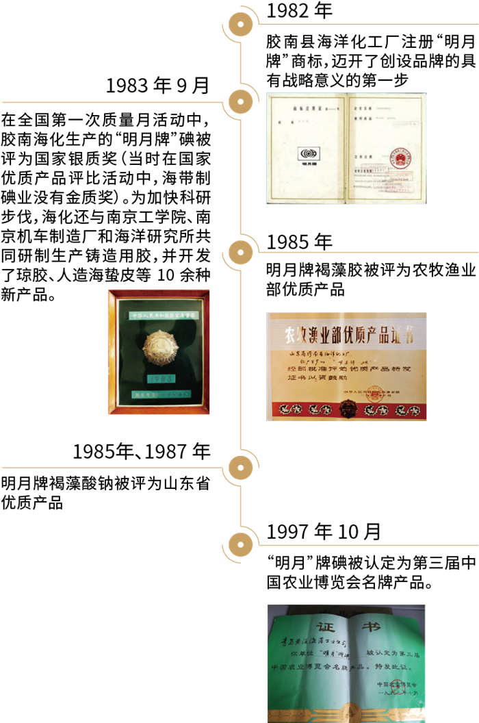 膠南縣海洋化工廠自籌建創(chuàng)始起,就高度重視新技術(shù)、新工藝、新產(chǎn)品和新品牌的研發(fā)創(chuàng)造,形成了注重技術(shù)改造、致力產(chǎn)品創(chuàng)新的傳統(tǒng)精神,并首創(chuàng)了一個(gè)美麗溫馨、蘊(yùn)涵豐富、意義深遠(yuǎn)的品牌——“明月牌”制碘產(chǎn)品。