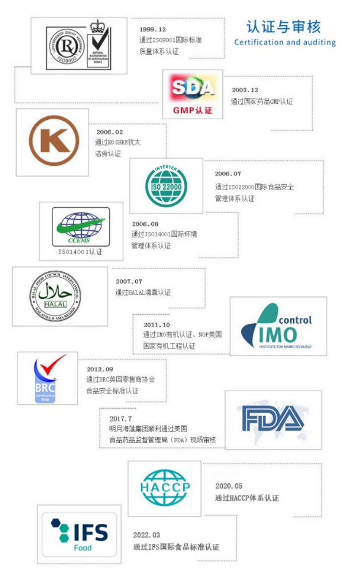 質(zhì)量是企業(yè)的立身之本、發(fā)展之基、信譽(yù)之源。企業(yè)改制25年以來,明月海藻集團(tuán)始終堅(jiān)持“堅(jiān)持質(zhì)量至上,滿足顧客期望,確保技術(shù)優(yōu)勢,領(lǐng)先市場競爭”的質(zhì)量方針,建立了一套科學(xué)化、數(shù)字化、網(wǎng)格化的全員質(zhì)量管理體系。公司擁有“青島市首席質(zhì)量官”,擁有高水平的產(chǎn)品質(zhì)量檢測中心,并通過了ISO9001、ISO22000、ISO14001、BRC、GMP、KOSHER、HALAL等系列認(rèn)證。