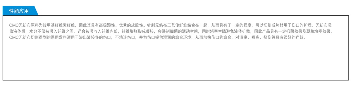 CMC無紡布是將羧甲基纖維素纖維以非織造工藝制備得到的無紡布產(chǎn)品。非織造布產(chǎn)品柔軟疏松,同時又具有一定強度。CMC無紡布經(jīng)后續(xù)分切可以制作成各種尺寸規(guī)格的敷料片材用于傷口護(hù)理。公司具有小批量研發(fā)及大規(guī)模生產(chǎn)所需要的各種設(shè)備,可根據(jù)客戶要求生產(chǎn)多種克重和寬幅的卷材,并可根據(jù)需要切割成任意規(guī)格的片材。